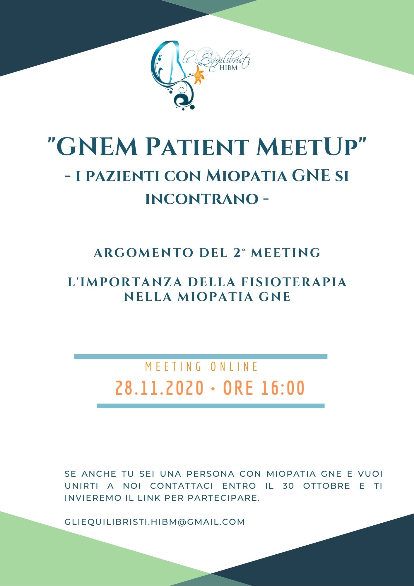 L’associazione GliEquilibristi HIBM darà vita al secondo incontro online “GNEM Patient MeetUp – I pazienti con Miopatia GNE si incontrano", che si terrà il 28 Novembre 2020 alle ore 16:00, con tutti i pazienti affetti da tale patologia.