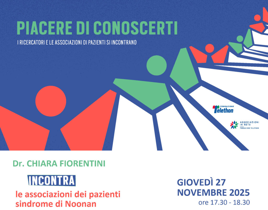 Giovedì 27 novembre, dalle ore 17:30 alle 18:30, la ricercatrice Chiara Fiorentini incontrerà online le associazioni dei pazienti Sindrome di Noonan e farà il punto sull’andamento del suo studio finanziato da Fondazione Telethon: